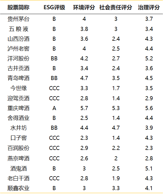 表1:中国酒业上市公司MSCI ESG评级排名情况(按评级排序)