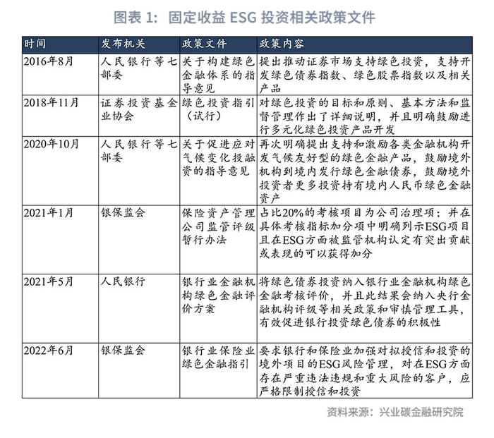 固收ESG投资近年来加速发展,一方面是因为国际信用评级机构相继加入联合国责任投资原则组织(UNPRI),推进将ESG整合进信用评价,为固收ESG投资提供了分析工具;另一方面,可持续类债券市场不断发展,评估标准完善与发行规模提高,固收ESG可投资标的持续扩容。2020年以来,随着全球对可持续发展关注增多,境内相关ESG投资的支持政策也逐步出台,银行、理财、保险和信托等投资机构开始布局ESG 投资市场,市场政策和基础设施建设也日渐完善。不同于权益ESG投资的推动与实践主体集中在公募基金,固收ESG投资实践更多来自银行机构——银行是债券最主要的投资者之一,因此银行的目标函数及约束条件会影响ESG固收投资策略的应用。由此,我们观察到的一个显著现象是:与固收ESG投资相关的政策多针对银行业,政策内容也多集中在绿色金融与环保产业相关政策[2]。