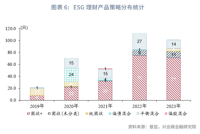 从产品的策略类型来看,目前“固收+”产品发行占绝对主导,约占全市场ESG理财产品的70%。