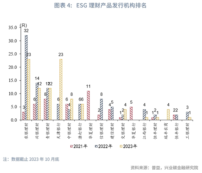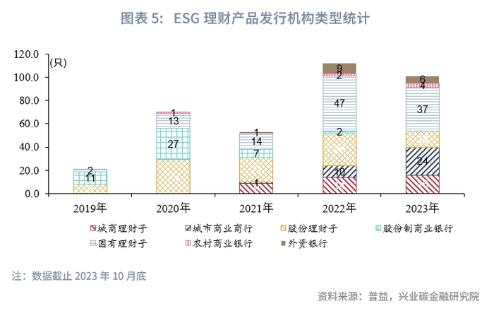 在2021年以前,ESG理财产品以股份行为绝对主导;自2022年起,国有行开始大力发展ESG理财业务,目前占据每年新发ESG理财产品数量的半壁江山。