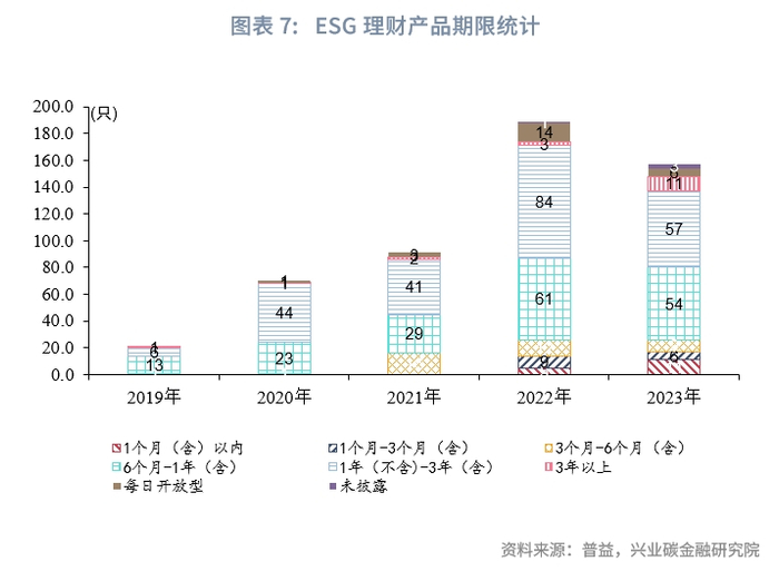 从产品期限来看,目前ESG理财产品期限普遍以6个月-1年、1年-3年为主,但我们注意到,近年来短期(1个月以内)ESG理财产品发行意愿开始快速增加。