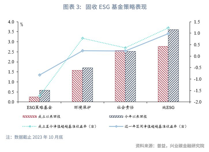 具体从策略表现来看,除了ESG策略基金,其他策略类型超额收益率差异不大。策略类型中,以纯ESG固收类产品的业绩表现最为优异,显示纯ESG策略的有效性在固收基金产品领域有很好的发展前景。