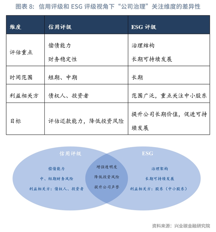 ② 就评级目的而言:信用评级的最终目标是评估企业的偿债能力,从违约风险的角度出发。它关注的是企业债务违约的潜在风险。而ESG评级则旨在评估企业在环境、社会责任和公司治理方面所采取的措施,以及未来可能面临的相关机遇和风险;