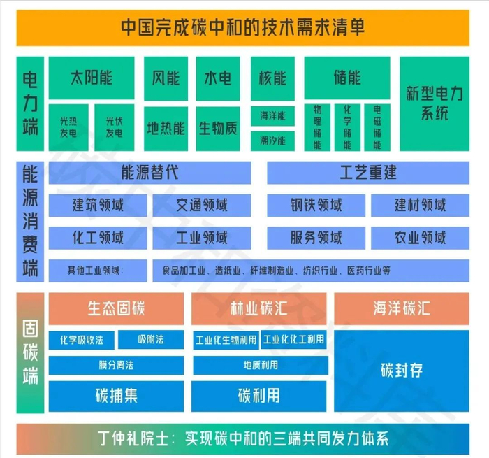 第三是固碳端,可以想见,不管前面两端如何发展,在技术上要达到零碳排放是不太可能的,比如煤、油、气化工生产过程中的“减碳”所产生的二氧化碳,又比如水泥生产过程中总会产生的那部分二氧化碳,还有电力生产本身,真正要做到“零碳电力”也只能寄希望于遥远的将来。因此,我们还得把“不得不排放的二氧化碳”用各种人为措施将其固定下来,其中最为重要的措施是生态建设,此外还有碳捕集之后的工业化利用,以及封存到地层和深海中。