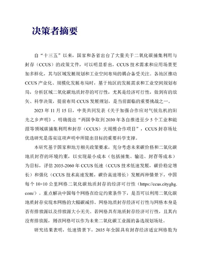 自“十三五”以来,国家和各省出台了大量关于二氧化碳捕集利用与 封存(CCUS)的政策文件,可以明显看出,CCUS 技术需求和应用场景更 加多样化,其与区域发展规划和工业空间布局的耦合备受关注。各地区推动 CCUS 产业化、规模化发展布局时,基于地区的发展需求和工业空间规划布 局,分析区域二氧化碳地质封存的可行性,尤其是经济可行性,做到有的放 矢、科学决策,提前布局 CCUS 发展规划,是当前面临的重要挑战之一。2023 年 11 月 15 日,中美共同发表《关于加强合作应对气候危机的阳 光之乡声明》,明确提出“两国争取到 2030 年各自推进至少 5 个工业和能 源等领域碳捕集利用和封存(CCUS)大规模合作项目”,CCUS 封存场址 优选研究是落实这项声明中所提出目标的重要科学支撑。
