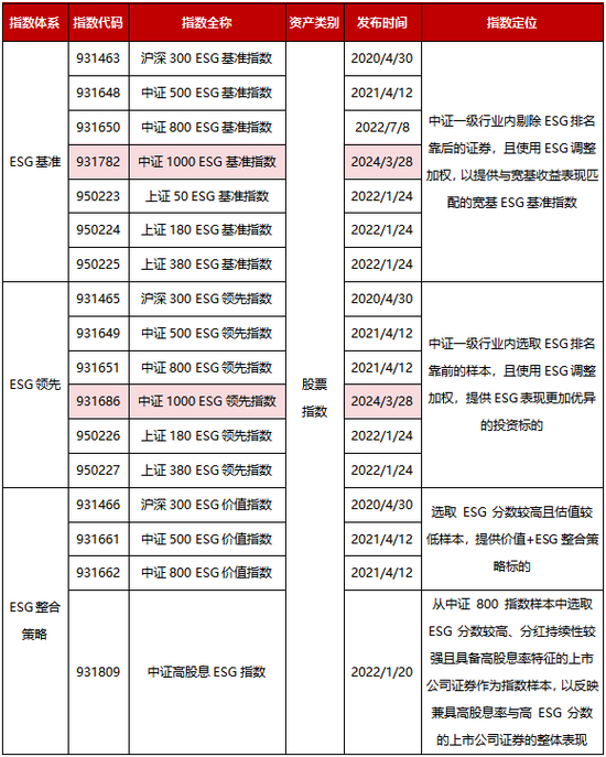 为进一步完善中证规模ESG指数的布局,中证指数公司于2024年3月28日正式发布中证1000ESG基准指数(931782)和中证1000ESG领先指数(931686)。中证1000ESG基准指数从中证1000样本中剔除中证一级行业内ESG分数最低的20%的上市公司证券后,选取剩余证券作为指数样本构建ESG投资基准;中证1000ESG领先指数从中证1000指数样本中选取ESG分数最高的300只上市公司证券作为指数样本,表征中证ESG评价结果较优的中小市值上市公司证券的表现。两条指数均采用经ESG倾斜因子调整后的自由流通市值加权。