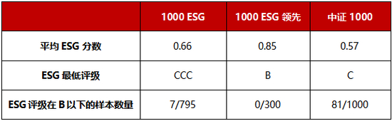 ESG评价结果显示,中证1000 ESG基准与中证1000 ESG领先指数样本股的ESG评价结果分布合理。中证1000ESG基准指数样本股的平均ESG分数为0.66,中证1000ESG领先指数样本股的平均ESG分数为0.85,均高于中证1000指数样本股。