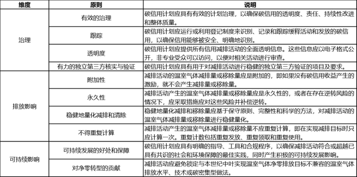 一是遵循高质量碳信用原则,提高碳信用质量。无论是国外还是我国,碳减排项目的质量一直是碳信用市场核心问题之一。以ICVCM代表的很多国际组织和机构已建立一套高质量碳信用原则体系,这些原则围绕信息透明度、减排量的永久性和附加性、减排绩效的核算质量、社会影响等方面对碳信用项目进行规范。一套清晰、完整且符合国情的高质量碳信用原则将有助于提高碳信用的可信度,进一步激发自愿减排市场的活力。