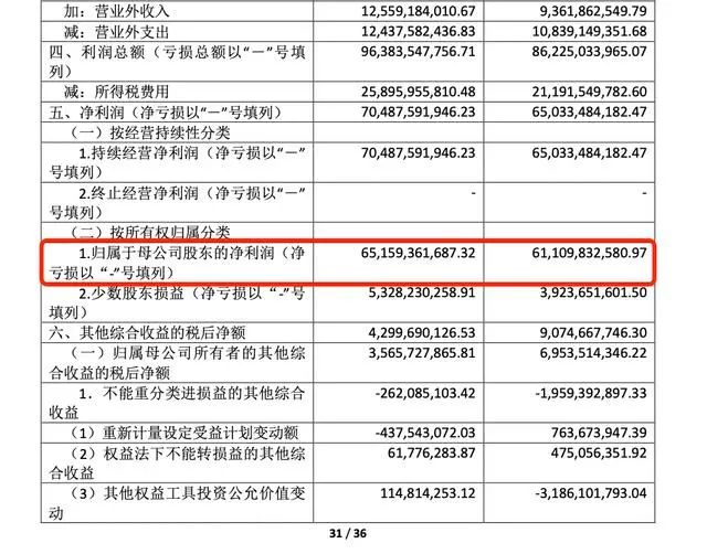 净利润:归属于母公司股东的净利润为651.59亿元,增长了6.63%。