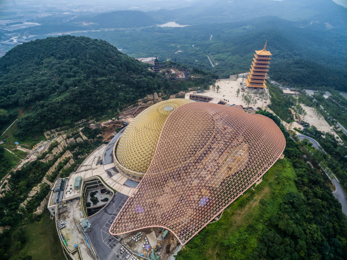 南京牛首山文化旅游区一期工程是佛顶骨舍利永久供奉地,位于江苏省南京市牛首山风景区,地上四层,地下六层,总建筑面积13.6万m2,利用历史形成的矿坑而建,以自然模拟山体形态的手法,形体上修复坍塌山峰,重现牛首山历史上恢弘格局。是一座古典与现代结合、当代建筑和佛教文化相融、弘扬和展现中国优秀文化的世界级佛教艺术殿堂。