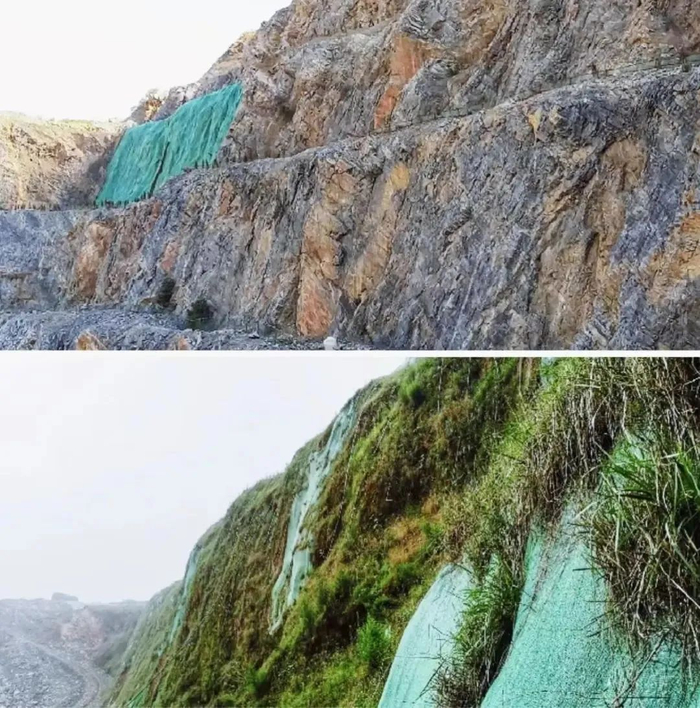 秉持“以自然的方式恢复自然”的理念,在裸露岩石表面重塑土层结构,为植物生长提供了有利的立地条件,克服了岩质边坡固土难、植被覆盖率低、治理效果难以持久的难题。植物种子在表层发芽生长,初期根系伸入底基层,后期根系伸入岩体裂隙或凸凹处,植物持续生长,实现种子在岩石上长成大树,且无需人工管理,与周边自然山貌相似度90%以上。实现新增碳汇,增强水土保持能力、改善气候、提高生物多样性。在“山水林田湖草沙”生态恢复领域内广泛实施并取得了示范性效果,尤其适用于岩质或土质等边坡及高陡边坡,包括露天金属矿山、露天非金属矿山等。已列入国家发展改革委、科技部、工业和信息化部、自然资源部组织编制的《绿色技术推广目录(2020年)》。