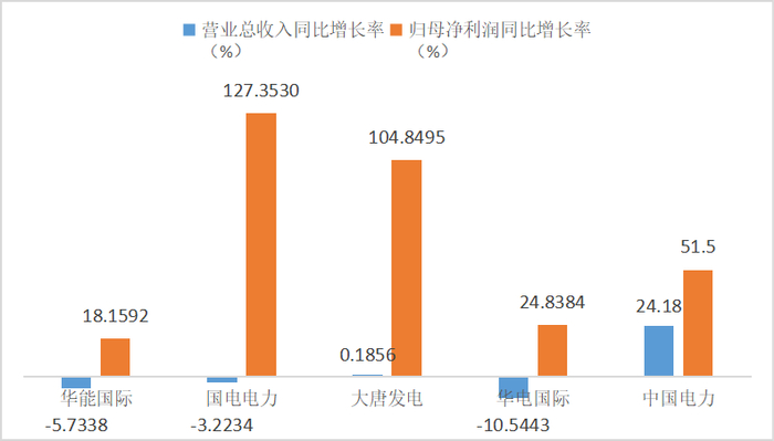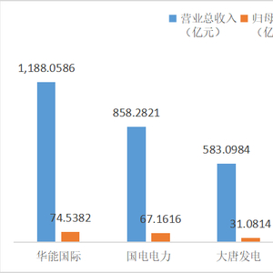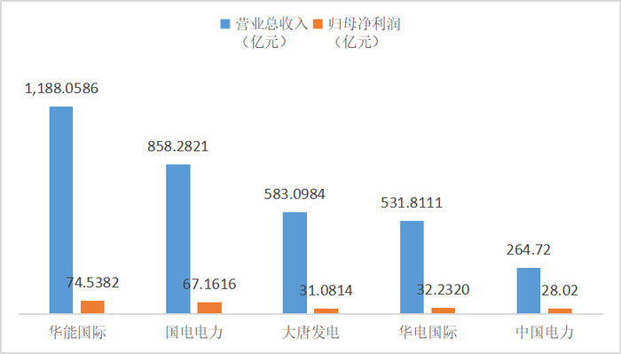统计业绩表现,华能国际上半年营收、盈利总额最高,分别实现1188.06亿元、74.54亿元;国电电力位列其后,分别实现营收858.28亿元、盈利67.16亿元。