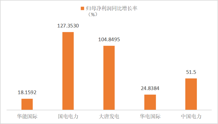 在业绩成长性方面,五大企业全部实现盈利正增长。其中国电电力、大唐发电上半年归母净利润同比增幅最大,分别为127.35%、104.85%,双双翻倍。