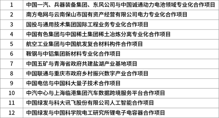 9月25日,国务院国资委召开中央企业专业化整合推进会,开展重点项目集中签约。共有12组26家单位专业化整合项目集中签约,涉及电网、新能源、电池等领域,详情如下: