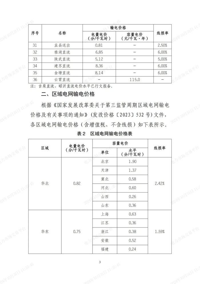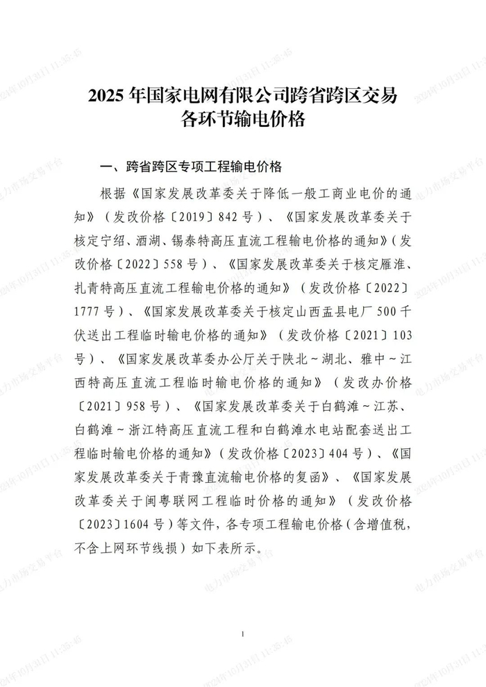 北京电力交易中心公布2025年国家电网有限公司跨省跨区交易各环节输电价格。其中包含跨省跨区专项工程输电价格、区域电网输电价格、送出省输电价格、专项工程降价分享空间价格表。