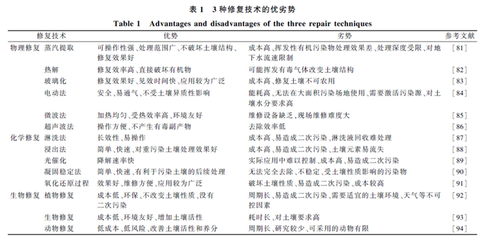 针对土壤中有机污染物降解等一系列问题,科学家和研究人员通过大量实验研究,提出了多种解决方案,目前主流修复技术分为物理修复、化学修复和生物修复3 种。以上3 种修复技术优劣势对比如表1所示。