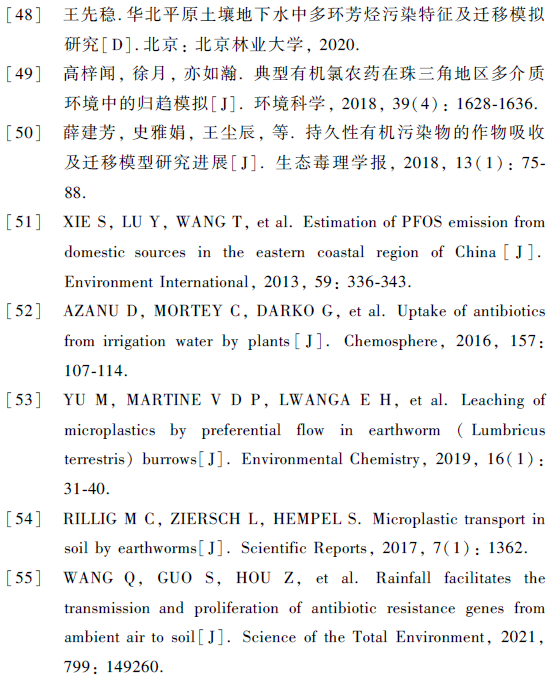 ECs 还能通过动植物富集,由土壤向生物圈迁移。全氟辛基磺酸(PFOS)在环境中主要以离子盐的形式存在,因此表现出其主要随水体流动传输的特征,进而能通过蒸腾流大量进入作物体内[50] 。薛建芳等[50] 发现作物对PFOS 富集程度受灌溉水体浓度影响,并且高污染地表水和地下水对作物存在潜在生态风险。土壤中的PFOS 来源广泛,并且PFOS 从土壤到作物的转运过程是一个浓度依赖过程,即土壤中浓度越高,作物中浓度也越高,对作物产生潜在的生态风险[51] 。Azanu 等[52] 研究表明,当植物(即胡萝卜和生菜) 暴露于不同浓度(0. 1 ~ 15 mg/ L) 的抗生素时,植物体内累积的四环素(TC)和阿莫西林(AMX)浓度分别为4. 4~36. 8,13. 7~45. 2 ng/ g。另外,有些土壤生物能迁移微塑料,如蚯蚓在土壤中的活动能极大的提高微塑料颗粒丰度,粒径较小的聚乙烯微珠可能被向下运输[53] 。当蚯蚓摄入微塑料后,由于蚯蚓的胃肠道消化功能,使微塑料粒径变小,并通过粪便富集[54] 。这些研究均表明ECs 能够从水体/ 土壤向动植物迁移。ARGs 在空气中也有被检测到,降雨能促进其从大气到土壤的传播和增殖。Wang 等[55] 检测了作为载体的PM2. 5 中ARGs 的丰度,观察降雨过程(4 mm / h) 对ARGs 传输的影响。结果表明,雨水作为载体促进了ARGs 的传播,风和颗粒物(PM) 浓度可能是影响ARGs 在雨水中分布的气象参数。此外,还通过土壤微宇宙实验研究了降雨对不同环境背景土壤中抗生素抗性的影响。雨水促进了ARGs 和可移动基因元件(mobile genetic elements, MGEs) 从环境空气到土壤的扩散,这种影响在重金属污染的土壤中更为明显。