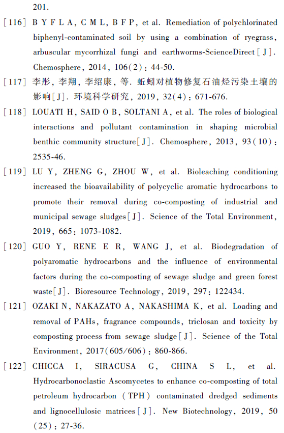 当前随着堆肥技术的成熟,其对有机污染物降解的研究逐步深入,研究表明堆肥技术可以生物降解有机产品,如多环芳烃[119-121] 、石油碳氢化合物[122] 、邻苯二甲酸酯类增塑剂[123,124] 、有机氯农药[125] 、多氯二苯并二恶英/ 呋喃[126,127] 和多氯联苯[128] 等,未来可将堆肥技术与其他修复方法相结合,进而寻找一种更高效便捷、操作简单、绿色经济的土壤修复方案。