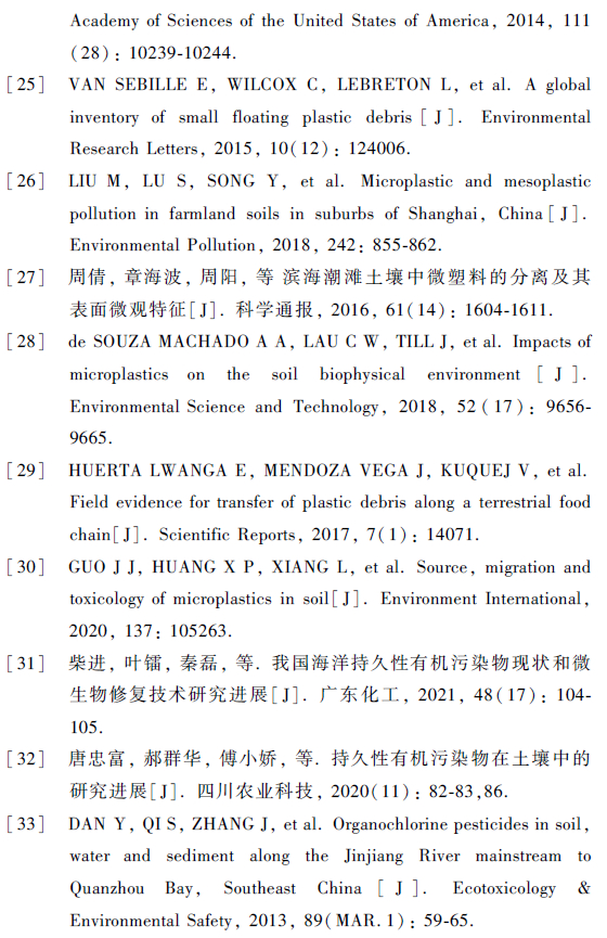 作为新型污染物,微塑料是指直径<5 mm 的异质混合塑料,包括塑料纤维、颗粒和碎片[24] 。科研人员发现微塑料无处不在,根据全球微塑料的最新估计,2015 年,漂浮在海洋表面的微塑料有93 万~23. 6万t,相当于多达51 万亿个颗粒[25] 。而陆地生态系