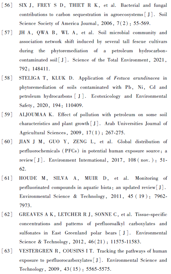 持久性有机污染物(POPs) 是指人类合成的,具有持久性、生物积累性、生物毒性,并且能够进行长距离迁移的物质[22] 。由于POPs 具有疏水亲脂性,易与有机物结合,它们附着在土壤等颗粒物表面,不断扩散迁移,经河川汇入、地表冲刷以及大气沉降等途径在环境介质中不断传播[31] 。POPs 随着食物网逐渐富集,使不同能级的有机生物因其浓度差异而表现出不同毒性,严重破坏生态系统[32] 。现有众多研究者对我国环境中POPs 进行分析检测,其中,Yang 等[33]在福建晋江、泉州湾取样,测得晋江地区对氯苯基三氯乙烷( dichlorodiphenyltrichloroethane, DDTs) 含量(以干重计)在1. 77~25. 03 ng/ g,平均含量为(11. 36±8. 46) ng/ g;泉州湾的DDTs 的含量为1. 53 ~ 53. 26ng/ g,平均含量为(9. 72±14. 66) ng/ g。西安城区土壤中有机氯农药(organochlorine pesticides, OCP) 含量在1. 027~39. 632 μg/ kg;多氯联苯(polychlorinatedbiphenyls, PCB) 含量0. 110 ~ 13. 497 μg/ kg[34] 。史兵方等[35] 研究发现,百色市工业区表层土壤中16 种多环芳烃(polycyclic aromatic hydrocarbons, PAHs)总含量在18. 7 ~ 6437 ng/ g。全氟和多氟烷基化合物(per/ polyfluoroalkyl substances, PFASs) 的存在也从最初检测到的2 种增加到目前的17 种之多[36] 。以上研究已证实我国生态环境中所存在的POPs 污染状况并不容乐观,尤其是工业区。若POPs 在各环境介质中长期停留,必然会进入到食物链中,最终危害人体健康。因此,对POPs 的监管、有效防治途径以及修复受污染场地已刻不容缓。