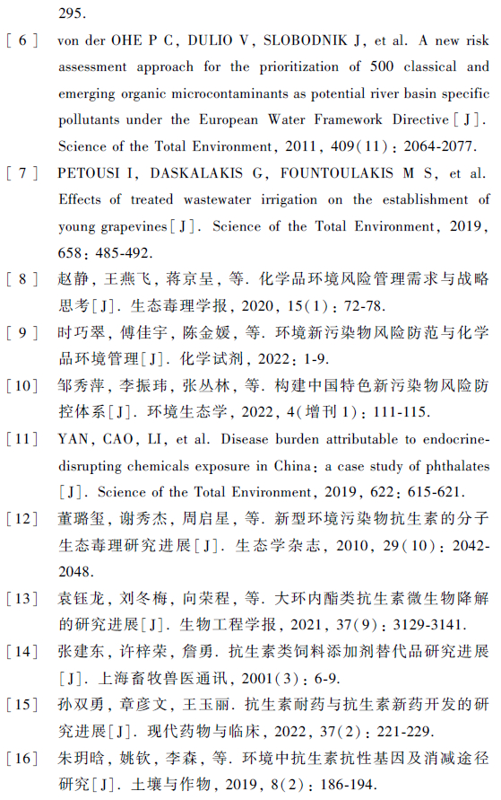 根据《中国现有化学物质名录》统计,我国现有的化学物质约45000 种[8] 。我国对ECs 风险防范于2001 年底开始起步,先后出台制定了《国家环境科技发展“十五”计划纲要》《水污染防治行动计划》《关于履行<关于持久性有机污染物的斯德哥尔摩公约>禁止六溴环十二烷生产、使用有关工作的通知》《关于进一步加强塑料污染治理的意见》《遏制细菌耐药国家行动计划(2016—2020 年)》等一系列与ECs 管理相关的政策、法规、标准及规划,随后提出对多溴二苯醚在内的环境内分泌干扰物和全氟化合物等20 余种(类)污染物进行全面或部分淘汰,并开展对抗生素、全氟化合物以及微塑料等污染物饮用水水质监测[9] 。至今,我国已初步建立了新型持久性有机污染物、环境内分泌干扰物及微塑料等新型污染物的管理办法[10] ,开展新污染物的基础调查,设立专项研究课题,针对新污染物开展生物健康影响、生态环境影响及毒性机理等方面的研究[11] 。