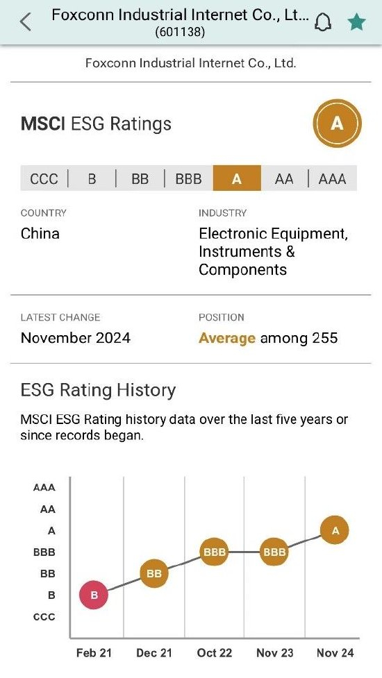 近日,MSCI(中文简称“明晟”)将工业富联的最新ESG评级结果上调至A级,相比于 2020年的 CCC级,4年内工业富联的ESG 评级上升了4级。