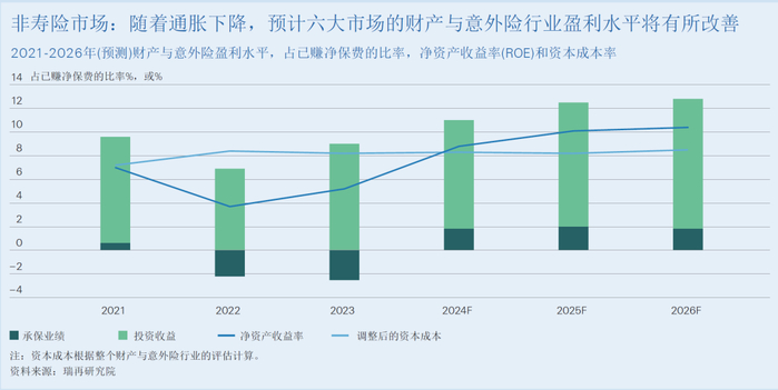 在全球通胀回落和保险费率延续上涨的双重推动下,预计2025-2026年非寿险承保业绩将保持强劲增长,全球六大非寿险市场的行业净资产收益率(ROE)预计将达到10%,高于资本成本。
