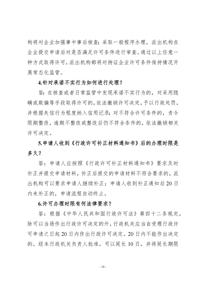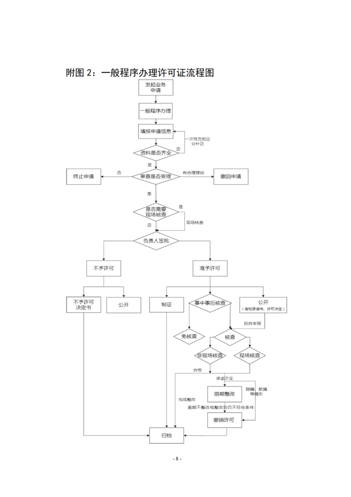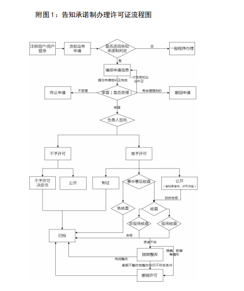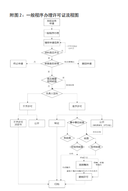 答:许可证办理方式分为告知承诺制(流程详见附图 1)与一般程序(流程详见附图 2)两种,办理流程主要包括申请材料提交、申请材料审查、作出许可决定、信息公开等环节。