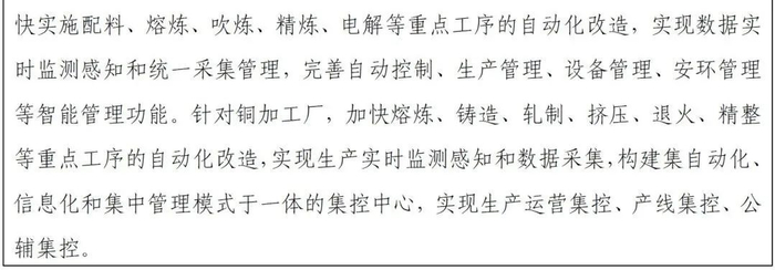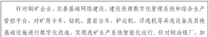 10.推进数字化转型智能化升级。落实《原材料工业数字化转型工作方案(2024—2026 年)》《有色金属行业智能工厂(矿山)建设指南》《关于深入推进矿山智能化建设 促进矿山安全发展的指导意见》,深入推进数字化、智能化技术在全产业链的深度应用。推动铜矿山、冶炼、加工企业开展基础网络、基础自动化、管理信息化改造升级,加快实现企业的数字化、网络化、智能化。支持行业龙头企业打造一批智能矿山、工厂和典型应用场景,发挥先进典型带动作用,加速新技术、新装备、新模式推广应用。面向关键设备故障解决、生产过程控制、安全环保智能管理等场景,大力推动人工智能(AI)技术与铜行业的融合应用。(工业和信息化部、国家发展改革委牵头,自然资源部、国务院国资委、国家矿山安监局参加)