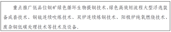 在国内原料保障基础方面,一是推动国内资源增储上产。扎实推进新一轮找矿突破战略行动,协同开展矿山污染治理与生态修复,加快推进在产项目扩能、新项目建设。二是鼓励矿产资源综合利用。加强钼、金、银等伴生资源综合利用,提高资源开采回采率、选矿回收率和综合利用率。三是强化再生资源回收利用。加强废铜加工配送能力,推动再生铜产业集约化、高值化发展。