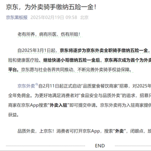 2月19日,中国外卖行业迎来历史性转折。当天上午,于2月11日宣布进军外卖市场的京东表示,将为所有全职外卖骑手缴纳五险一金,为兼职骑手配备意外险和健康医疗险,京东成为首个为外卖骑手缴纳五险一金的平台。京东表达了“愿与社会各界共同推动、不断完善外卖骑手权益保障”的心愿。