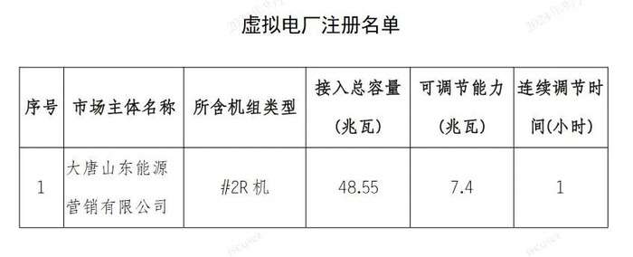 2024年9月,大唐山东能源营销有限公司虚拟电厂注册生效,资料显示,该虚拟电厂主体接入总容量48.55兆瓦,可调节能力7.4兆瓦。