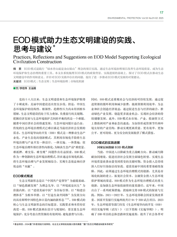 面对新形势新任务,本刊在生态环境部科技与财务司的指导下,联合生态环境部环境规划院EOD创新中心,围绕EOD模式创新整体思路、理论基础、实施机制、金融支持、地方特色实践等热点议题,邀请中国工程院院士王金南,中共中央党校(国家行政学院)教授李宏伟以及清华大学、浙江大学、中国人民银行金融研究所、国家开发银行、中国农业发展银行总行、国家绿色发展基金股份有限公司、中国环境科学研究院、中国城市规划设计研究院、E20研究院等单位研究EOD模式创新的专家学者、研究人员等撰文,策划推出主题为“创新EOD模式 助力美丽中国建设”的专刊系列文章,全景式解读EOD模式创新与应用,以飨读者。