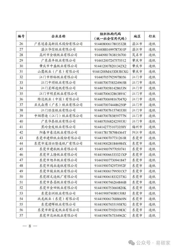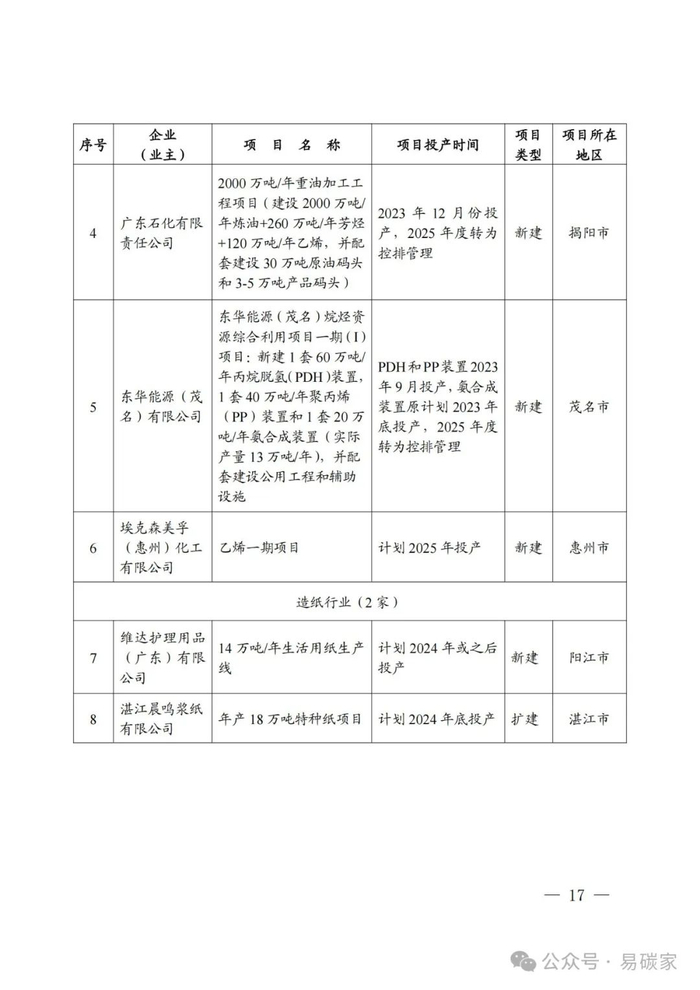 本省行政区域内石化、造纸、民航、陶瓷(建筑、卫生)、交通(港口)和数据中心行业已列入国家和省相关规划,并于2023—2025年建成投产且预计年排放1万吨二氧化碳(或年综合能源消费量5000吨标准煤)及以上的新建(含扩建、改建,下同)项目企业,共8家(附件2)。