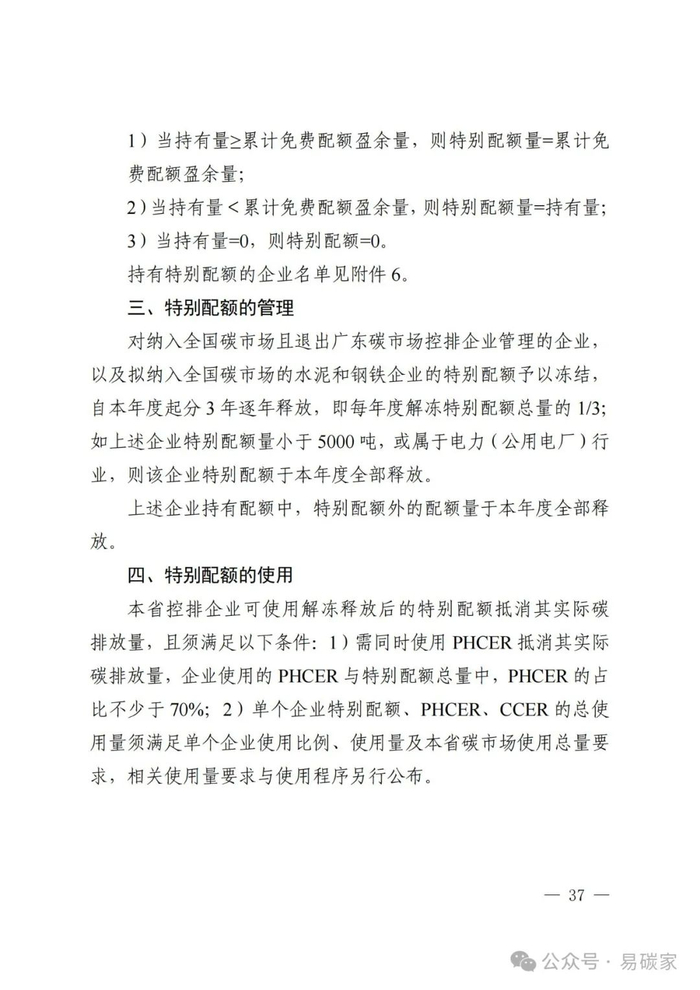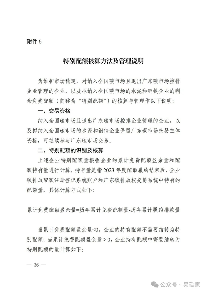 (一)对纳入全国碳市场且退出广东碳市场控排管理的企业,以及拟纳入全国碳市场的水泥和钢铁企业的剩余免费配额(以下简称“特别配额”)的管理方式详见附件5。持有特别配额的企业名单详见附件6。