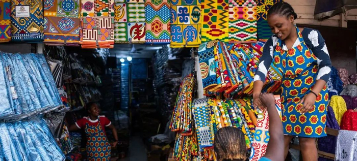 ©国际货币基金组织/Andrew Caballero-Reynolds|加纳的一个市场上,一位店主正在销售非洲印花布料