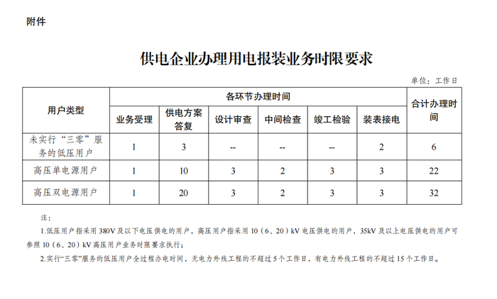 (一)巩固提升“三零”服务。拓展“三零”服务对象。全力支持民营经济发展壮大,将及以下各类民营经济组织,鼓励有条件的地区进一步提升低压接入容量上限。提高“三零”服务质效。低压用户全过程办电时间,无电力外线工程的不超过5个工作日,有电力外线工程的不超过15个工作日;涉及10千伏及以上公共电网升级改造的,供电企业应同步建设配套电网,及时保障用户用电需求,电网升级改造工期无法满足接电时限规定的,应明确工程完成时限,并报送国家能源局派出机构及地方能源(电力)主管部门备案。创新“三零”服务模式。对于春灌秋收、炒茶烤烟、地摊夜市等场景中的临时性、流动性用电需求,供电企业应配合地方政府做好便民接电点规划建设,通过“扫码用电”等模式为群众提供免报装、快用电服务,支持乡村振兴发展,助力激发消费活力。