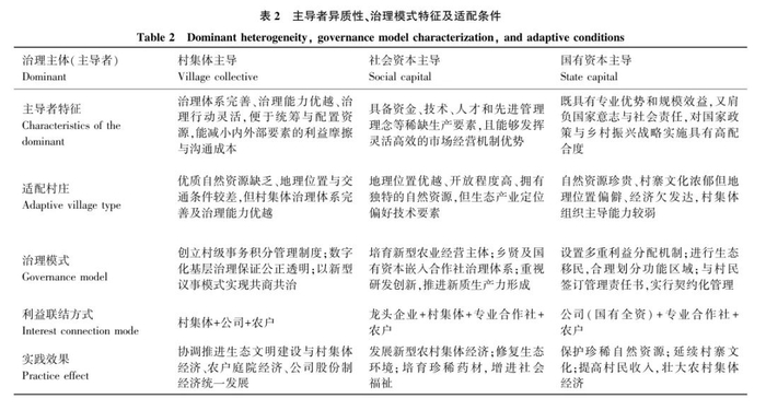 通过三种模式的共性与差异分析可知, 虽然主导生态产品价值实现的治理主体不同, 但都强调了农民的主体地位和市场化路径, 其中村集体主导模式侧重于内部治理能力的提升, 社会资本主导模式依赖于外部要素的导入, 国有资本主导模式则强调国家意志的体现(表2)。