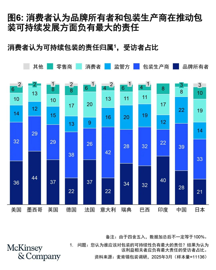 显然,相当一部分消费者倾向于选择那些符合其特定场景下可持续包装标准的品牌与产品。但值得关注的是:他们期待谁来主导这一变革?调研显示,当被问及该问题时,消费者普遍将品牌方与包装生产商视作推动可持续包装的首要责任主体,而对自身、零售商或监管者的责任期待明显较低(图 6)。在本文所有研究发现中,这一认知在各国消费者中表现出最强的一致性。