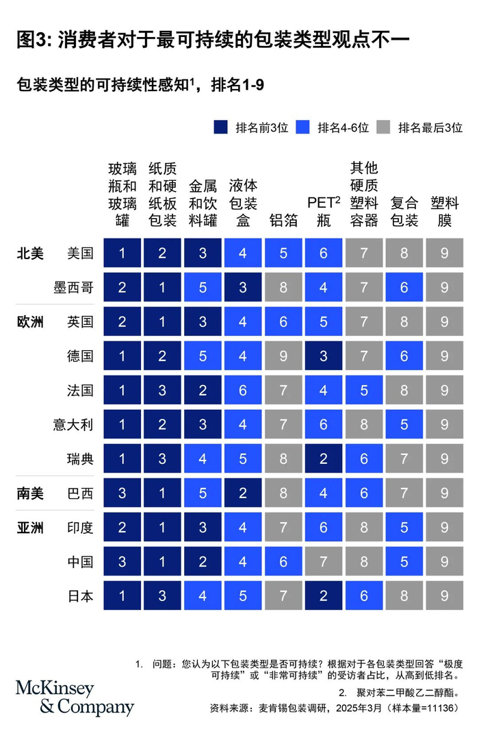 这些认知差异源于诸多因素,例如各国特有的回收模式以及消费者对相关回收项目的体验。在 PET 回收率最高的国家(如德国、瑞典和日本,回收率均超过 80%),受访者均将PET 列为前三大可持续包装材料;而在回收率最低的国家(如美国,回收率仅 33%),PET 的排名则垫底【18】。