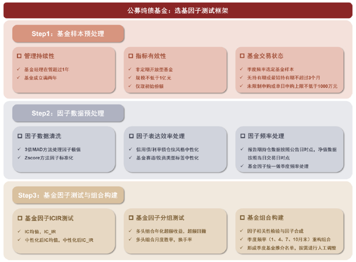 在此前发布的研究报告《归因溯源,繁中选优——公募基金因子评价体系》中,我们已搭建起公募基金因子测试框架,主体内容涉及:1)基金样本预处理,2)因子数据预处理,3)基金因子测试,共三步流程。本篇我们依据纯债基金组合构建的特性,做一些细节化的阐述。