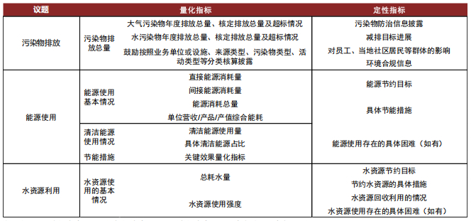 ► 明确具体信息披露要点及关键指标目标。《指南》提示上市公司依据《指引》重点披露议题相关的关键指标目标。对于污染物排放,应包括污染物排放信息、减排信息、对员工及当地居民等群体的影响、环境合规信息等披露要点。对于能源利用,应包括按类型划分的能源总消耗量、能源结构、清洁能源使用情况、能源节约目标及措施等披露要点。对于水资源利用,应包括总耗水量、使用强度、节约用水目标、水资源回收利用情况等披露要点。