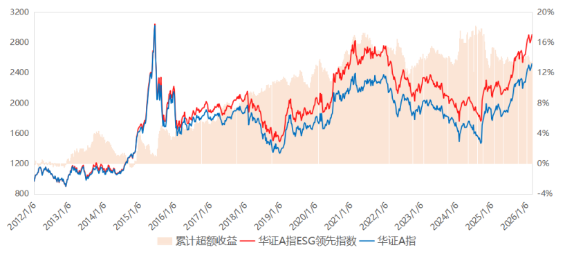 2012年至今,华证A指ESG领先指数相较华证A指的累计超额收益为14%。