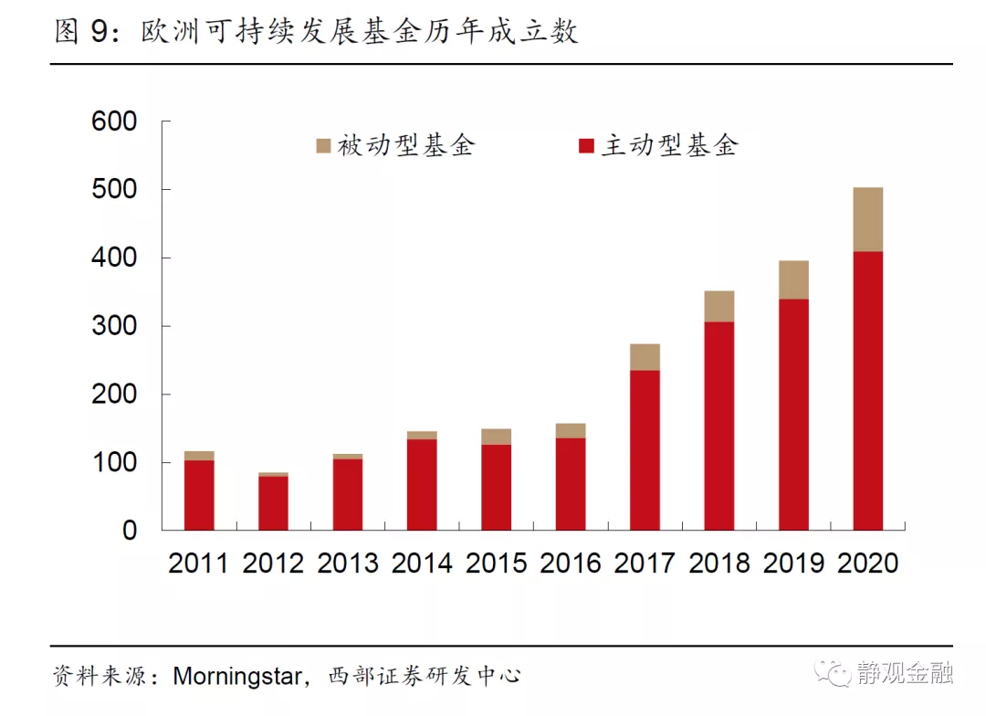 2022年我国企业ESG信息披露法规趋严,有望大幅推动ESG投资理念发展。前文介绍道,欧盟在2014年10月修订的《非财务报告指令》要求成员国不晚于2016年12月开始遵守其内容,使得欧盟企业ESG信息披露取得快速发展。根据欧盟经验,企业ESG信披加强或将显著提升ESG资管规模。根据Morningstar统计,欧洲地区可持续基金成立数量在2017年实现跃升(如图9),从2017年开始进入快速发展通道。