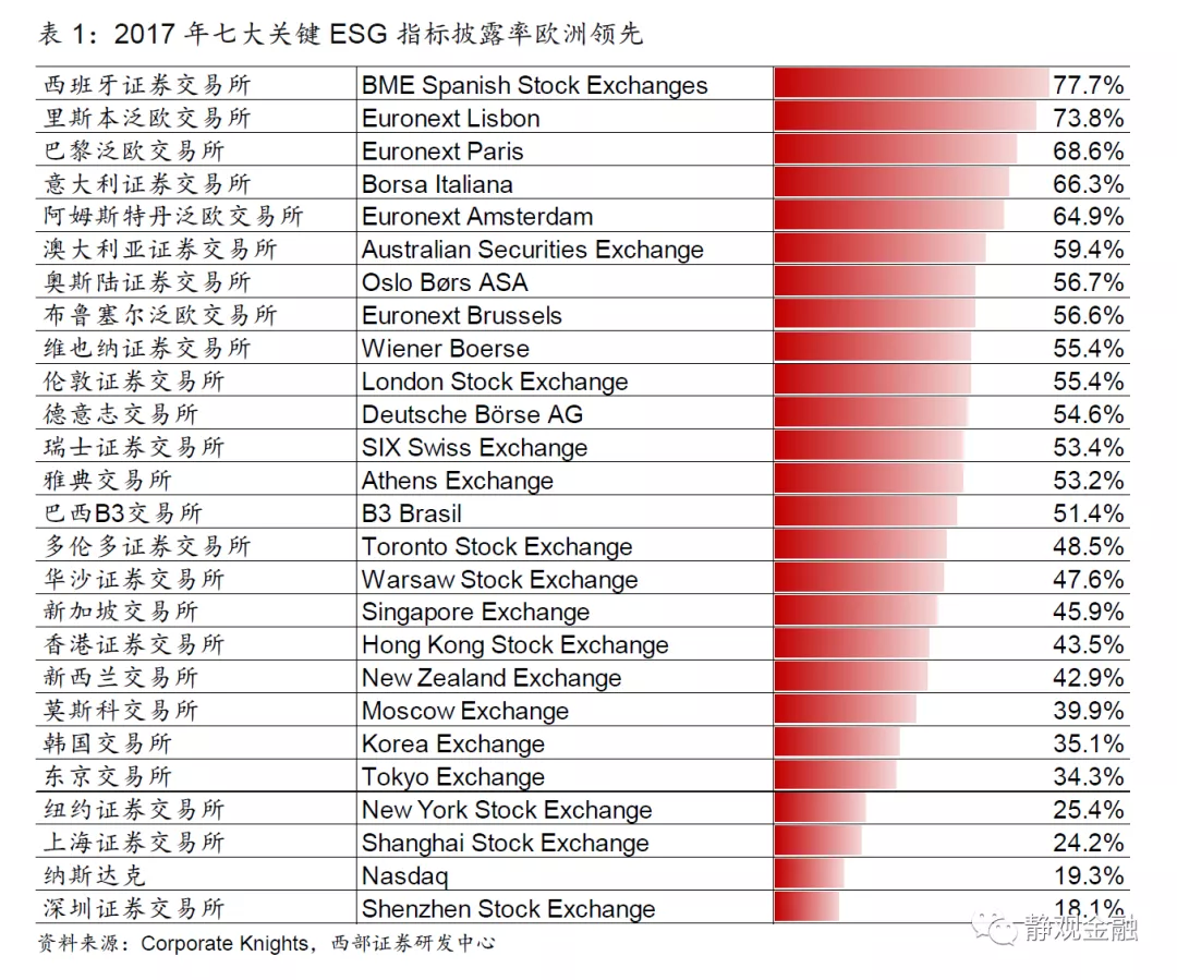 由此,2017年欧盟企业对关键ESG信息的披露率在全球领先。根据Corporate knights统计的各国主要交易所上市公司对七大关键ESG指标(能源、温室气体排放、水资源、废物、员工离职率、工伤率、员工薪酬)的披露率,西班牙、葡萄牙、法国、意大利、荷兰、德国在2017年分别达到77.7%、73.8%、68.6%、66.3%、64.9%、54.6%,明显高于同时期的美国、日韩等地区;年均复合增速(2013-2017 CAGR)分别为2.3%、3.7%、2.2%、10.7%、6.6%、5.9%。