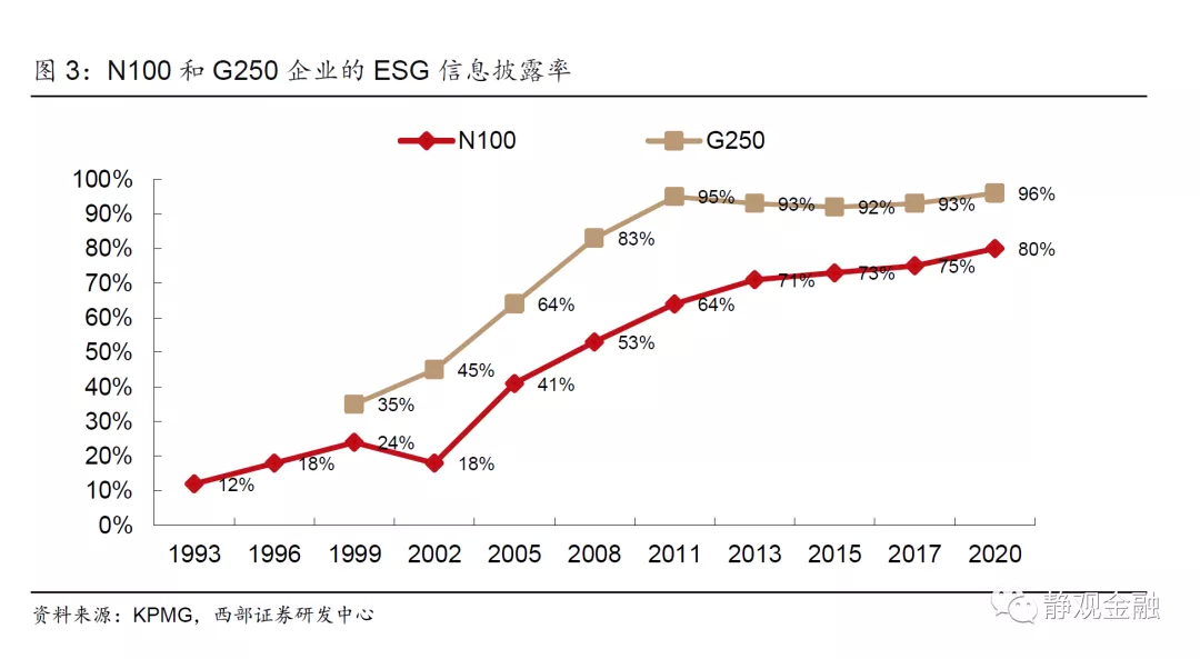 从全球范围来看,企业ESG披露率在本世纪初开始快速上升,最近十年增速放缓。相比之下我国ESG信息披露起步偏晚、提升空间较大。根据毕马威统计,在52个国家或地区中分别选出营收排名前100个公司作为N100(即样本总数 = 5200),2002-2013年N100公司可持续发展信息披露率从18%快速上升至71%,此后增速放缓。若选取《财富》全球500强中排名前250的公司作为G250,1999年有35%的G250公司披露了ESG信息,2011年G250的披露率升至95%,此后进入平台期,即全球范围内规模最大的一批公司(G250)基本在2011年之前开始了ESG信息披露,规模稍小的公司至今披露率仍在上升。相比之下,我国ESG信息披露起步偏晚。2020年全球N100企业ESG信息披露率达到80%,我国N100企业的披露率略低于全球平均水平为78%,较日本、美国、英国、以及德法等欧盟国家仍有较大提升空间。