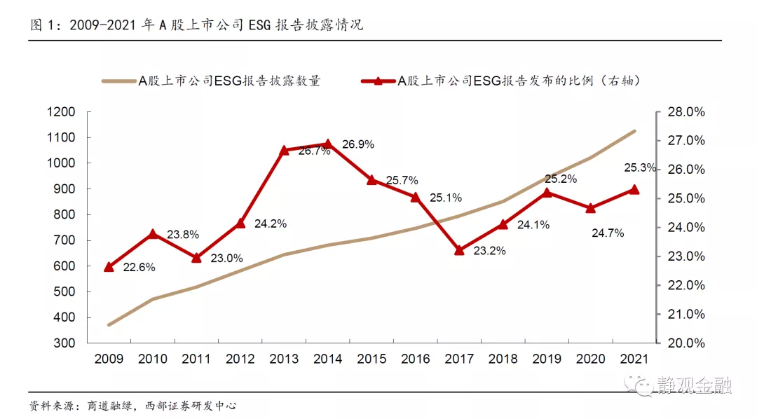 A股公司发布ESG报告的比例在最近10年呈波动,未有显著提升;沪深300成分股表现较好。根据商道融绿统计的A股ESG信息披露情况,2021年有25.3%的A股上市公司发布了2020年度ESG报告。2009年至2021年,A股市场披露ESG报告的份数保持增长,2021年有1125家公司发布了2020年度ESG报告,比前一年增加104份;但是A股公司发布ESG报告的比例在最近10年呈波动态势,未有显著提升,最高曾在2014年达到26.89%,最低在2017年降至23.22%,2021年回升至25.32%。