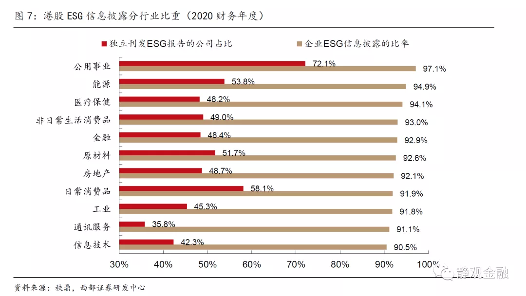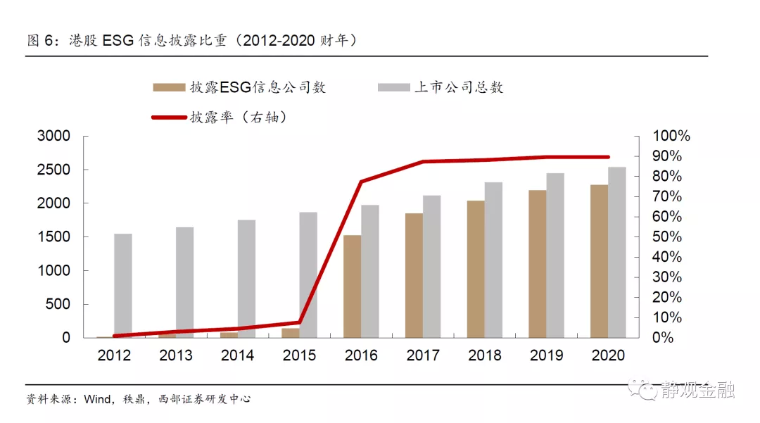 从ESG信息披露率来看,港股上市公司在2016财年实现跃升。2012年中国香港联交所发布的首版《环境、社会及管治报告指引》仅为自愿原则,2013年港股共计发布1643份年报,而披露ESG信息的公司仅50家,占比3%,其中17家单独发布ESG报告、33家随年报披露。2015年版本中增添“不遵守就解释”条文,2016财年港股ESG信息披露率因而实现标志性跃升。2015年仅141家公司披露ESG信息,占港股总数1866的7.6%;2016年共1526家公司披露ESG信息,占港股总数1973的77.3%。