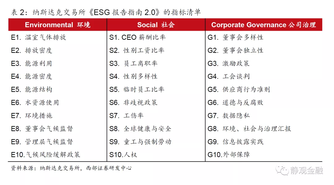 证券交易所则积极制定ESG报告指南,为公司编制报告提供帮助和指引。2019年5月纳斯达克交易所发布《ESG报告指南2.0》,该指南涵盖业界广泛采用的最新ESG报告方法,不强制要求其上市公司遵循,为自愿参与,目的是为上市公司提供参考,帮助其掌握不断发展变化的ESG数据披露标准。《指南2.0》列出了ESG指标的披露清单,如表2所示,环境、社会和公司治理分别包含十项指标;并针对每项指标给出了衡量原因、衡量方式、披露原因、披露形式、联系框架、披露率、注释和参考。