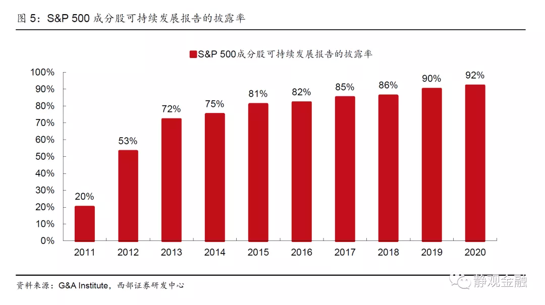 2010-2015年,标普500成分股中发布ESG报告的公司数占比快速增长。如图5,根据Governance &Accountability Institute(G&A)统计数据,标普500成分股中仅有20%的公司发布了2011年的可持续发展报告,至2015年快速上升至81%。披露率在突破80%之后增速放缓。标普500中发布2020年可持续发展报告的比例为92%。SEC要求强制披露的内容为公司遵守环境法规会产生的重大影响,以及公司的环境诉讼;对于其他的ESG信息仍未有强制要求。2021年3月,SEC宣布在执法部门成立一个气候和ESG特别工作组,将进一步加强对ESG和气候变化的关注,制定主动行动以识别与环境和ESG相关的不当行为,解决威胁投资者和市场的信息披露缺口。